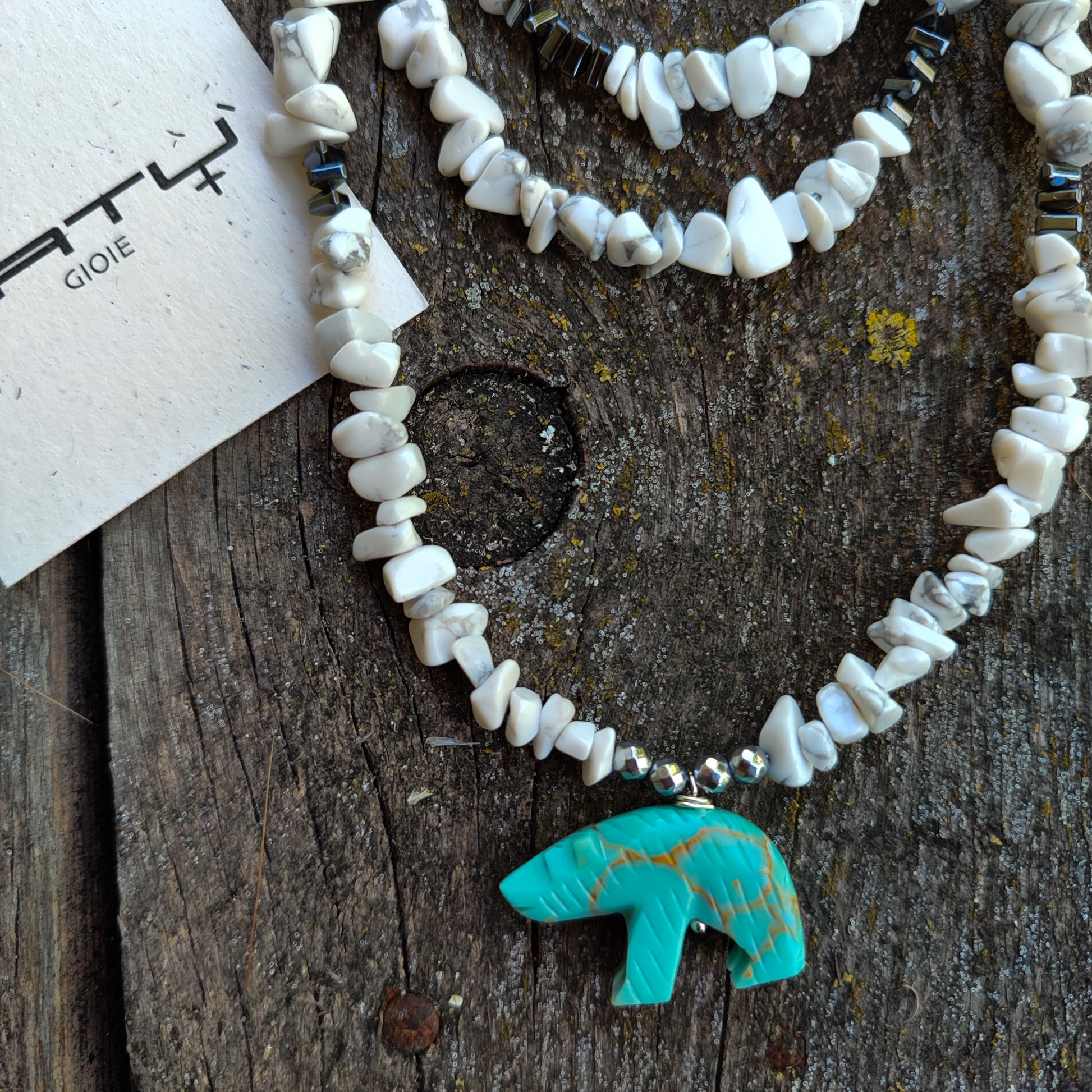 La combinazione di howlite e turchese crea un gioco di contrasti e armonie, proprio come il paesaggio unico dell'Alaska. Questa collana non solo abbellisce, ma racconta una storia di equilibri tra forza e delicatezza, tra tradizione e modernità.