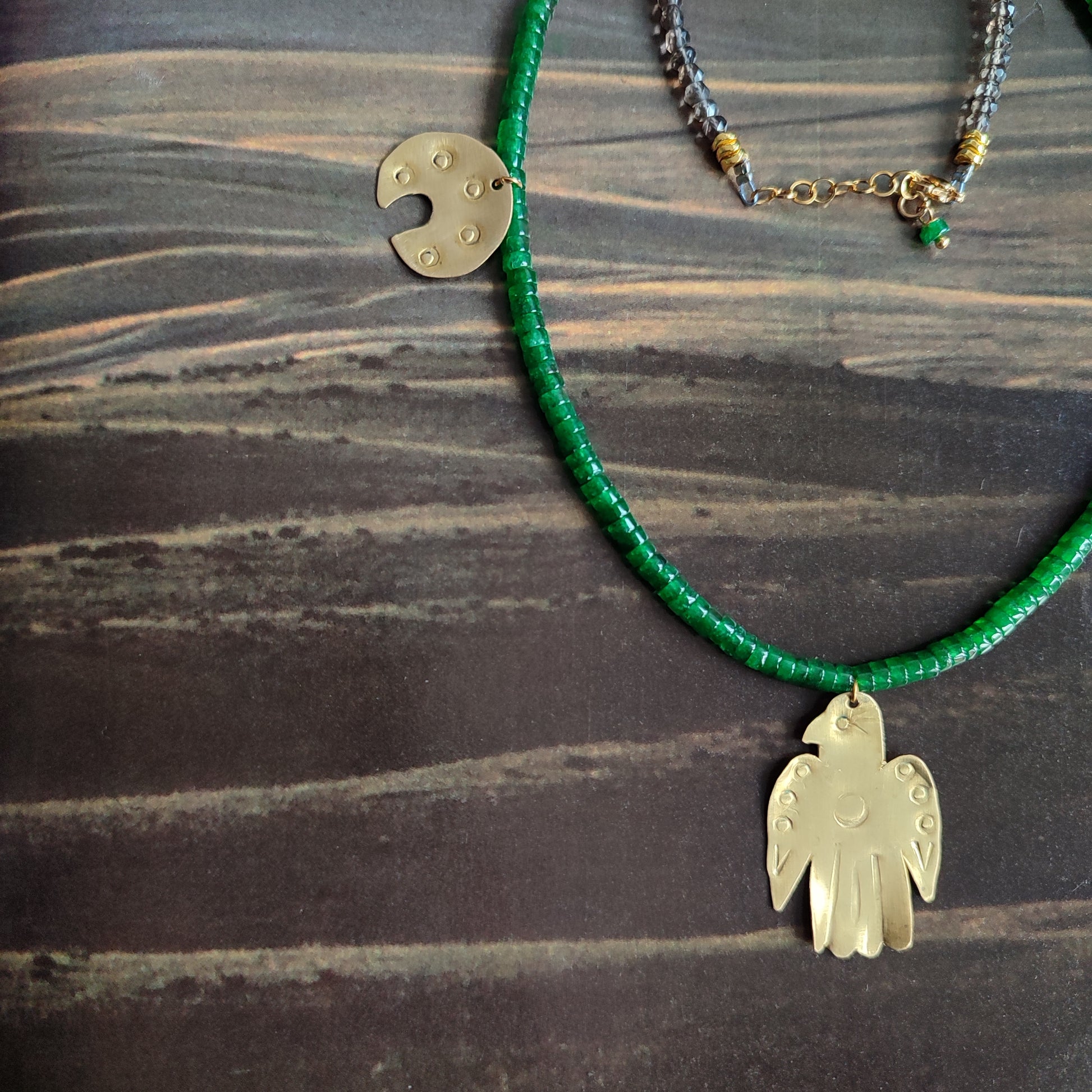 Realizzata a mano con GIADA smeraldite, rondelle di conchiglie. agata grigia, ematite. Il ciondolo e gli inserti sono realizzati in ottone. NICKEL FREE