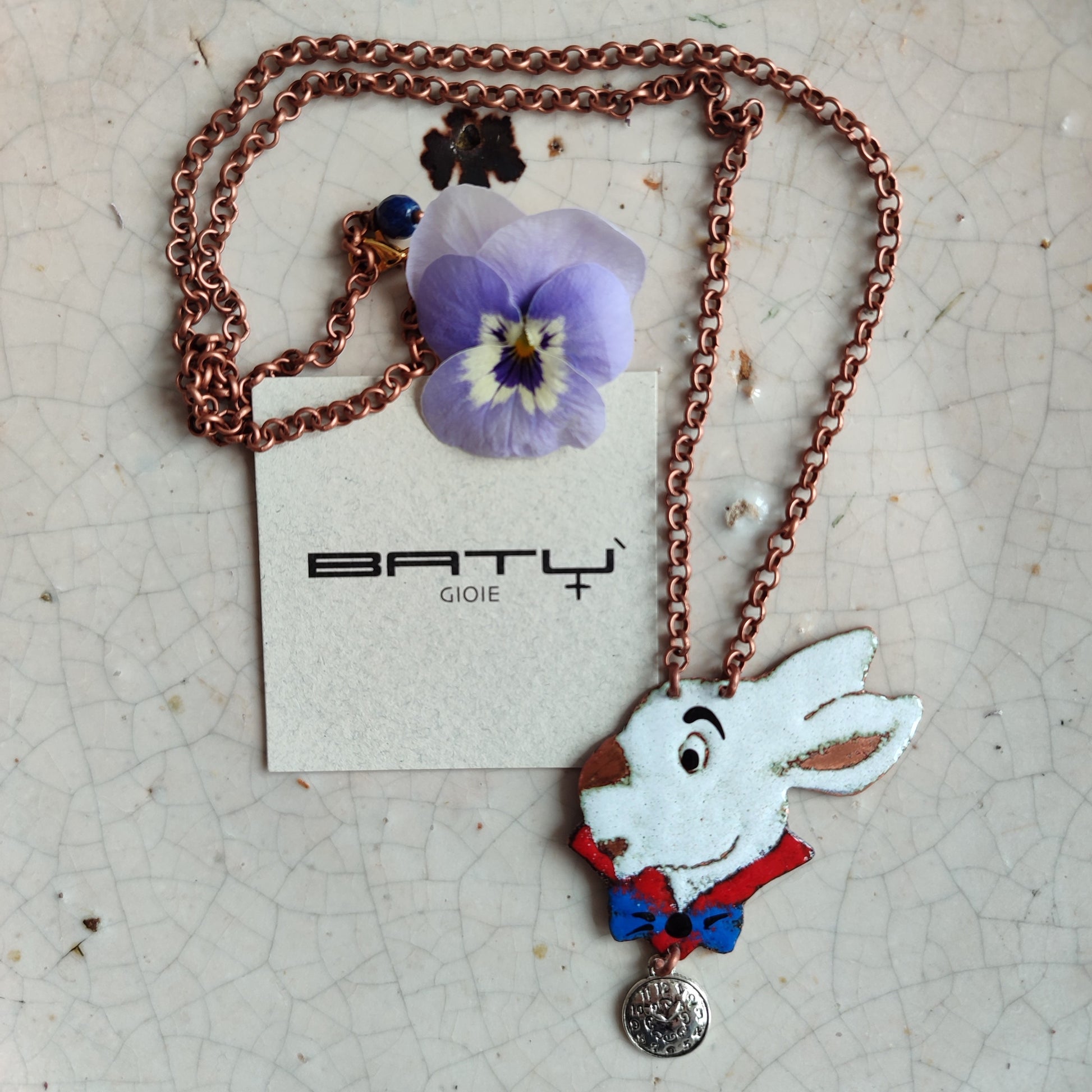 Realizzata interamente a mano in RAME smaltato, la catena è una lega NICKEL FREE. Il retro è liscio color rame.