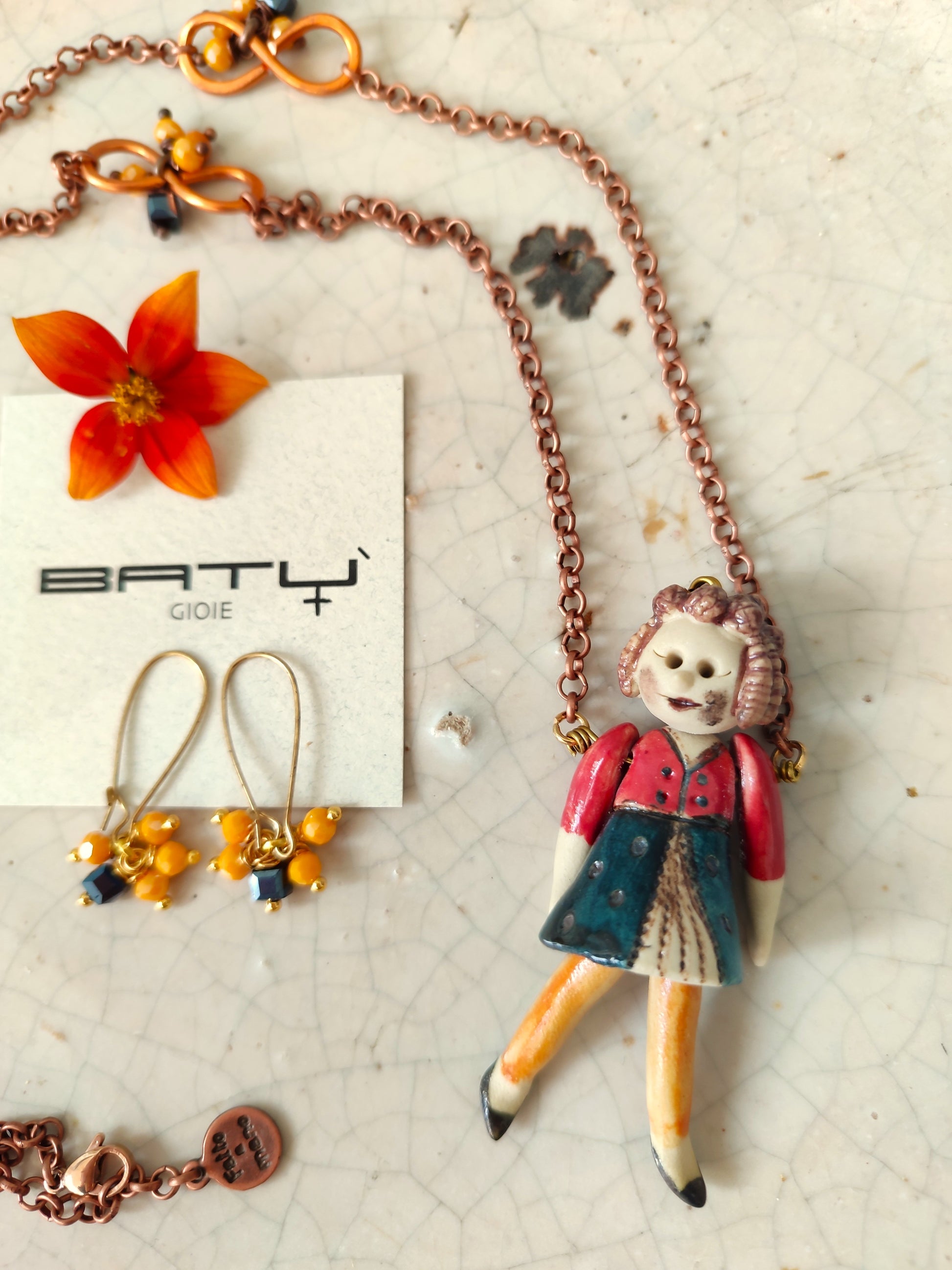 La collana è abbinata agli orecchini che ne richiamano i colori e completano il look.