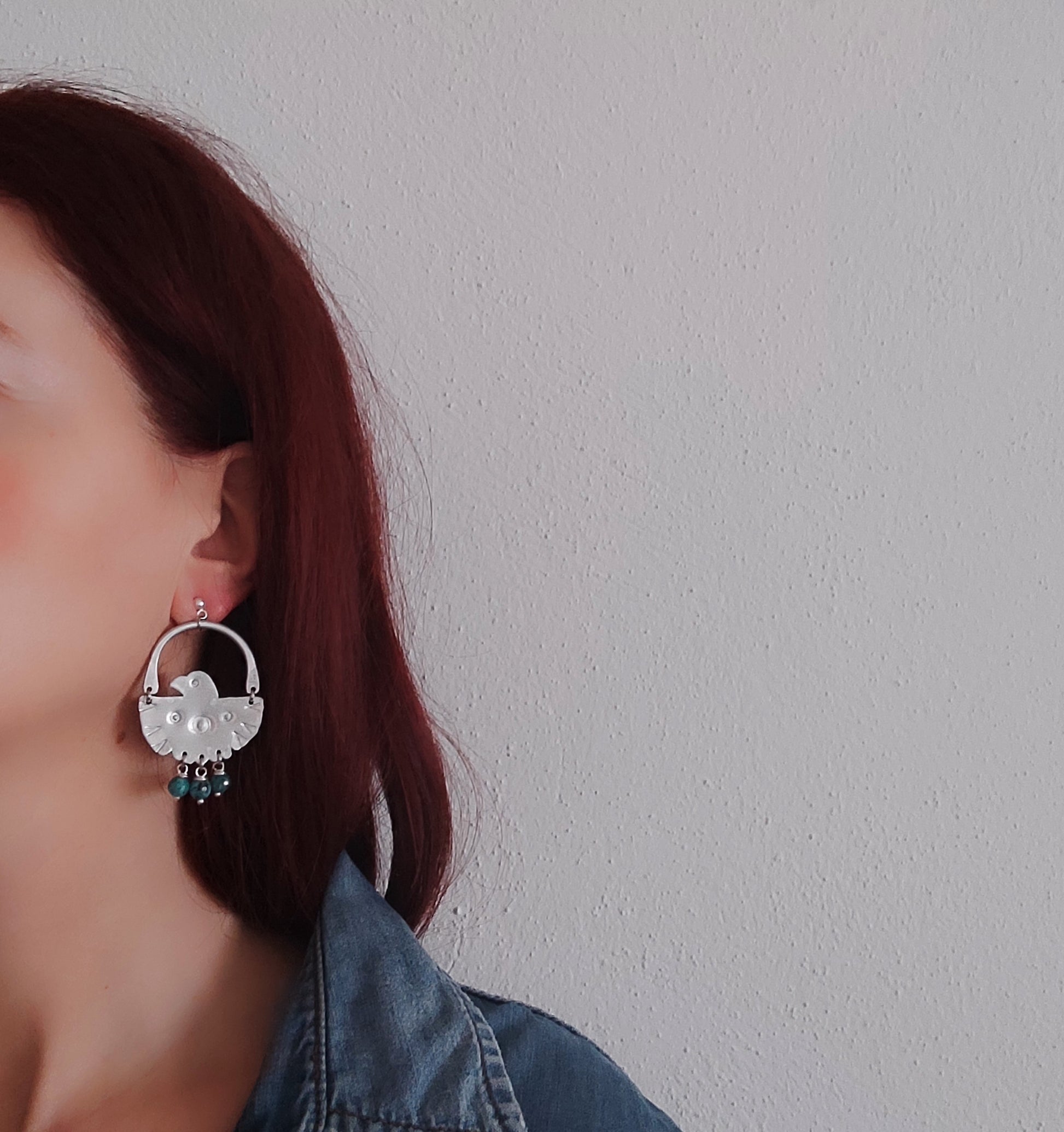 Orecchini interamente realizzati a mano in ALLUMINIO e AGATA azzurre, perno in acciaio NICKEL FREE , il retro è liscio. Peso circa 9 gr.