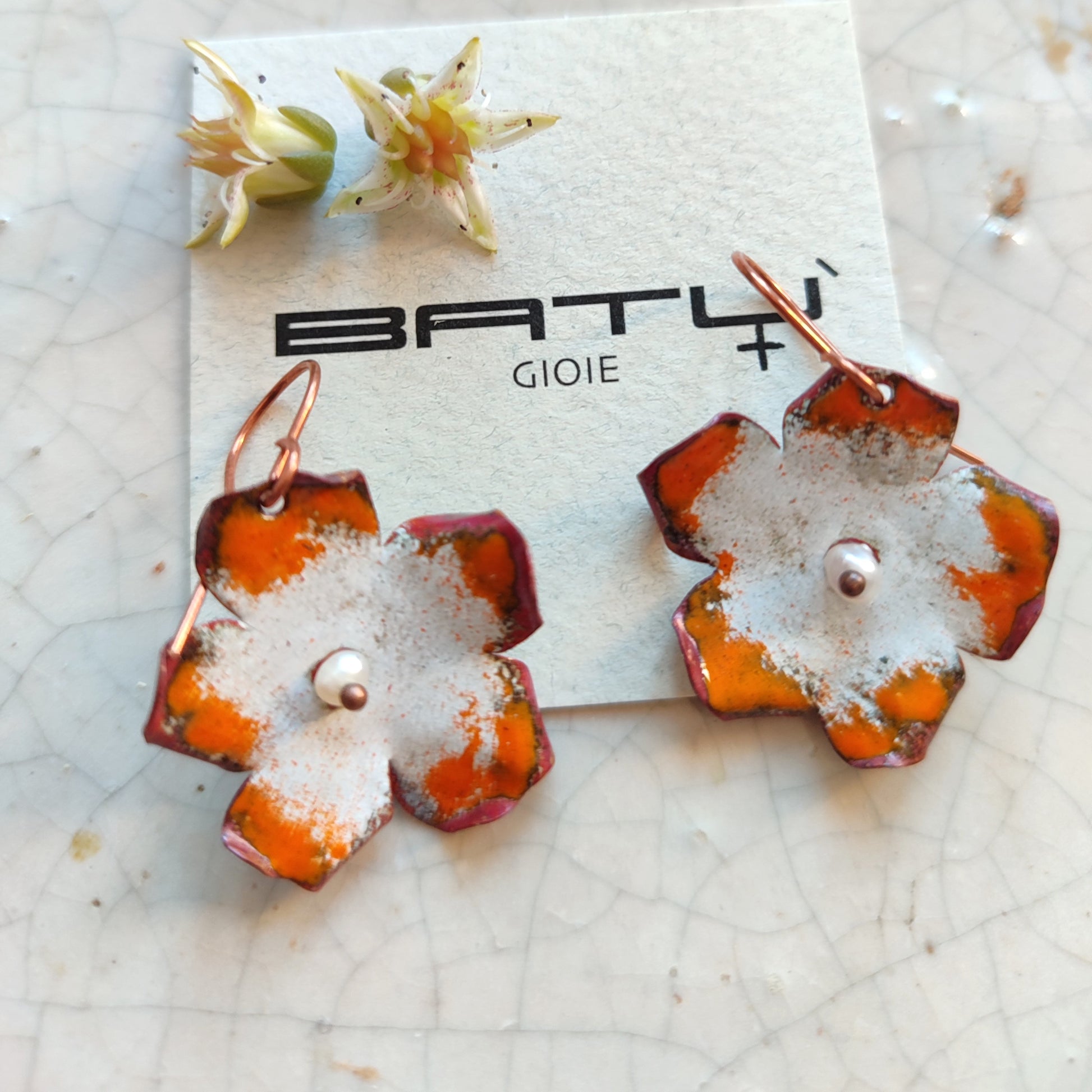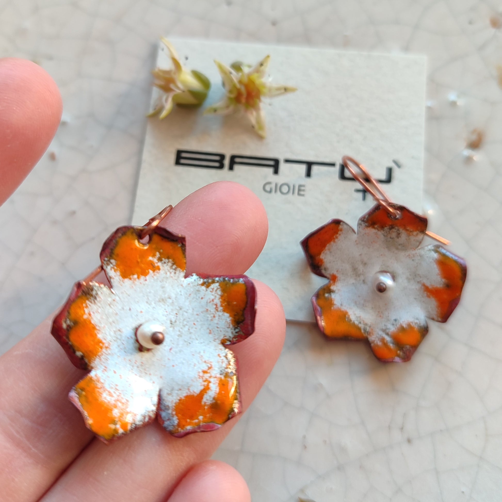 Realizzati interamente a mano in RAME smaltato, la monachella è rame NICKEL FREE , all' interno c'è una piccola perla di fiume. Il retro è liscio color rame.
