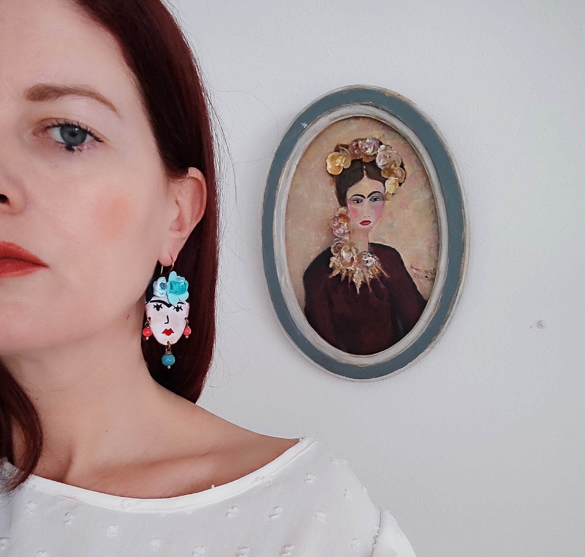 Gli orecchini ispirati a Frida Kahlo sono un omaggio all'iconica artista messicana, famosa per la sua arte vibrante e il suo stile unico.