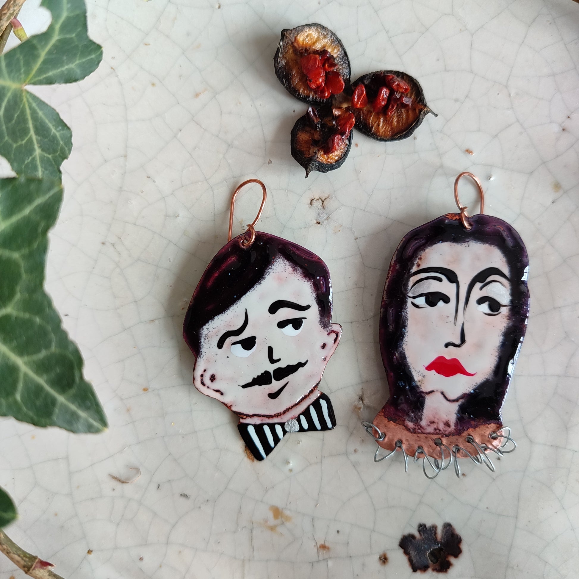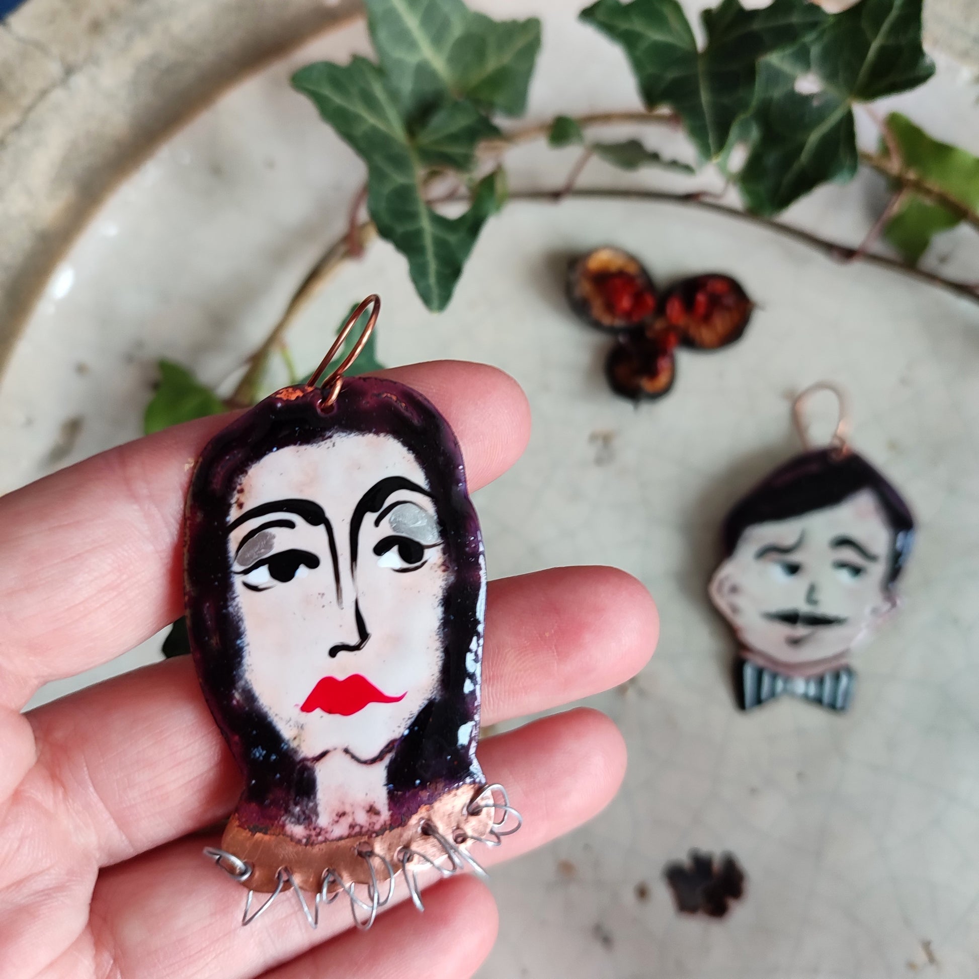 Realizzati interamente a mano in RAME smaltato, dipinti a mano, la monachella è rame NICKEL FREE . Il retro è liscio color rame.