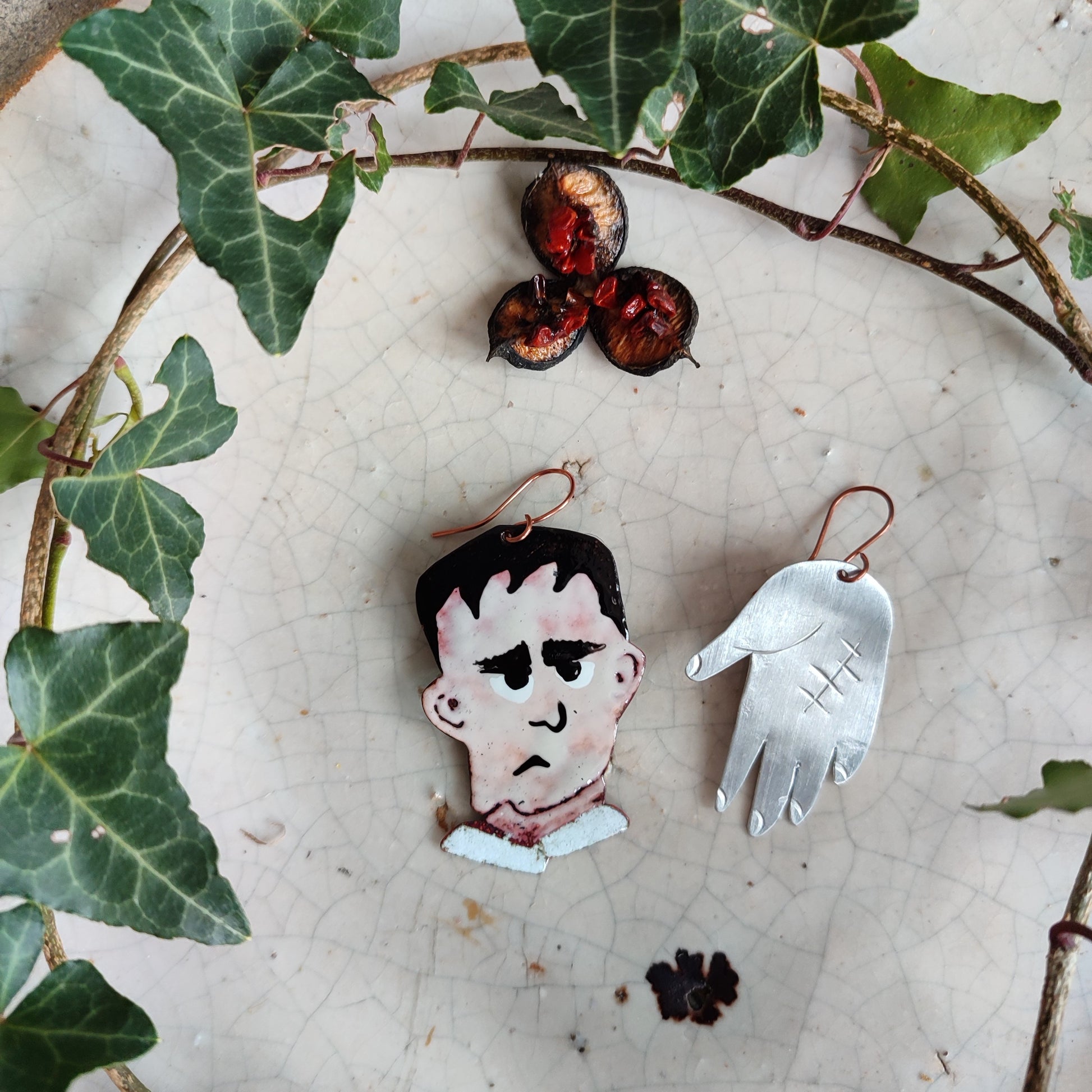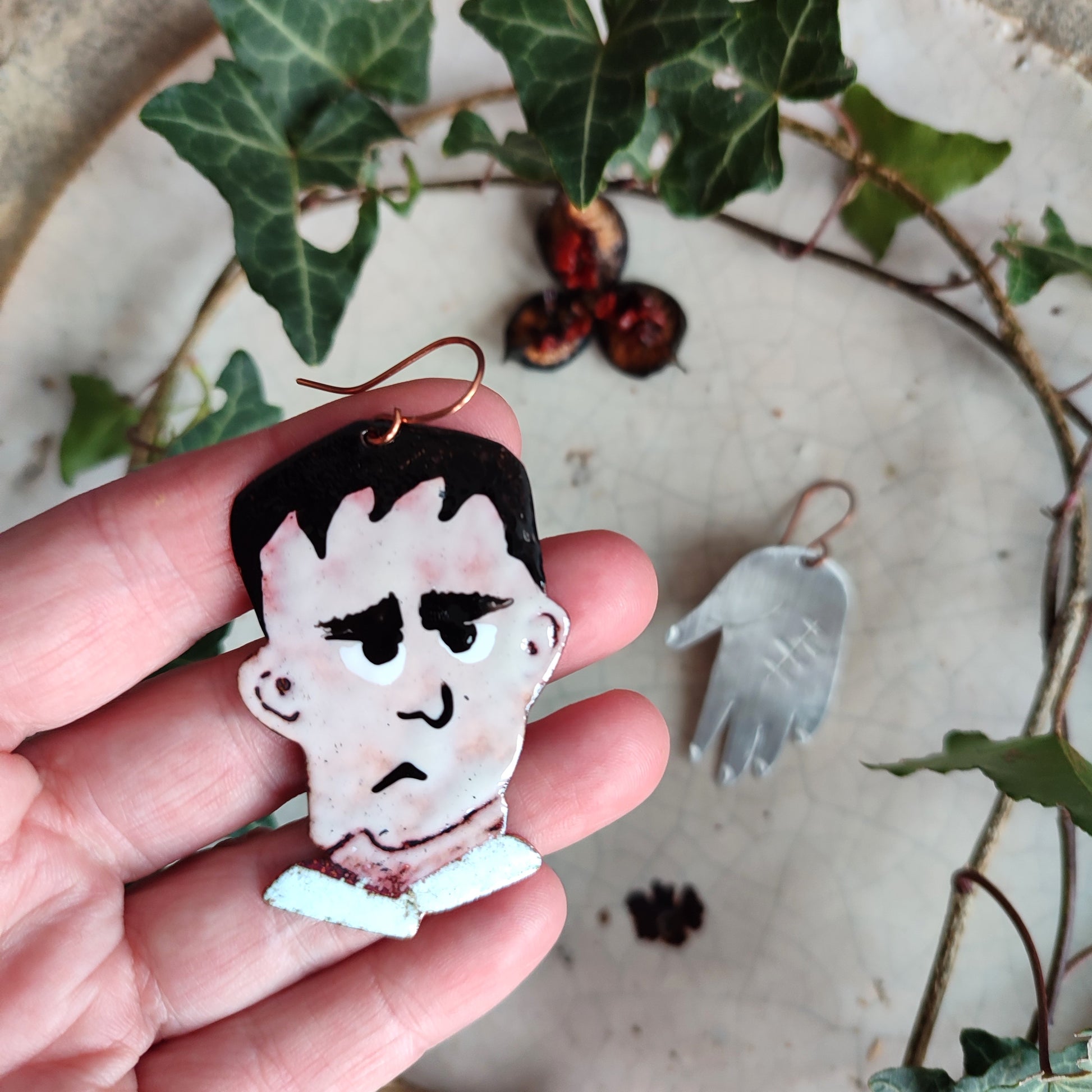 Realizzati interamente a mano in RAME smaltato, e alluminio, dipinto a mano, la monachella è rame NICKEL FREE . Il retro è liscio color rame.