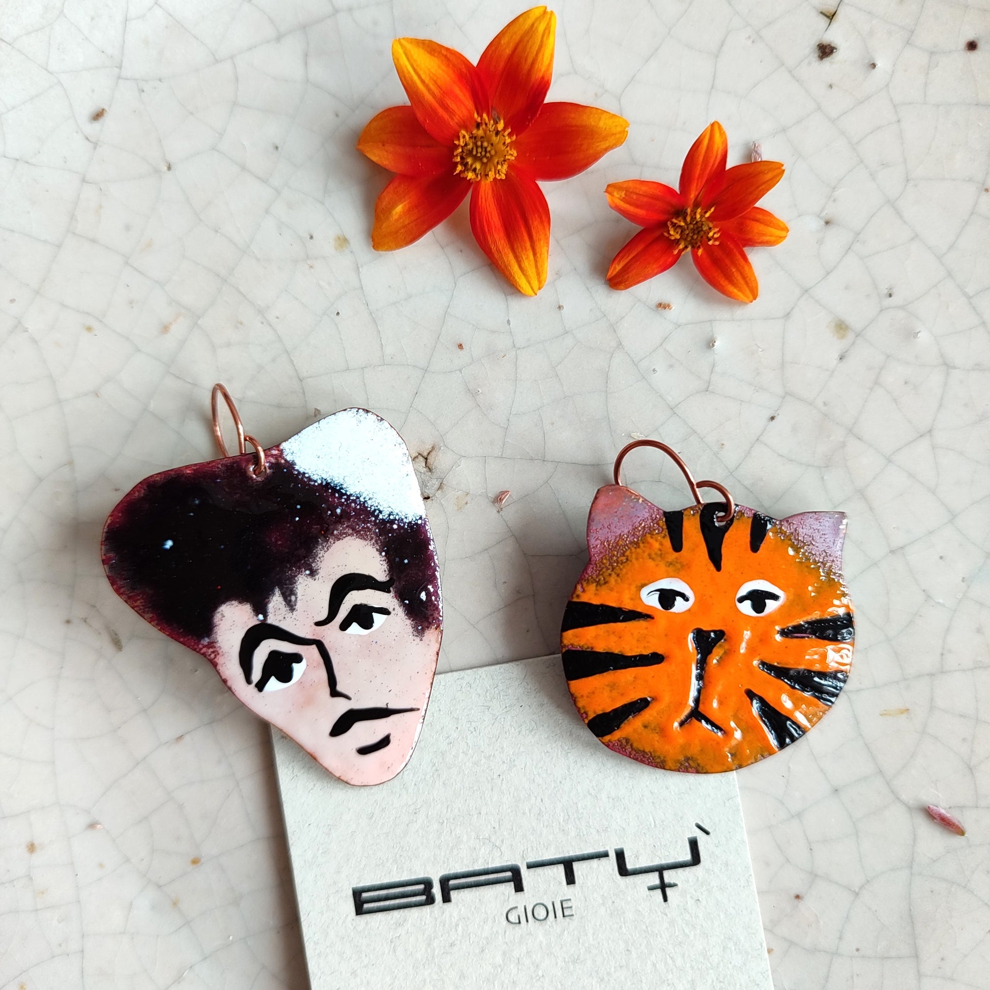 Realizzati interamente a mano in RAME smaltato, dettagli dipinti a mano, la monachella è di rame NICKEL FREE . Il retro è liscio color rame.