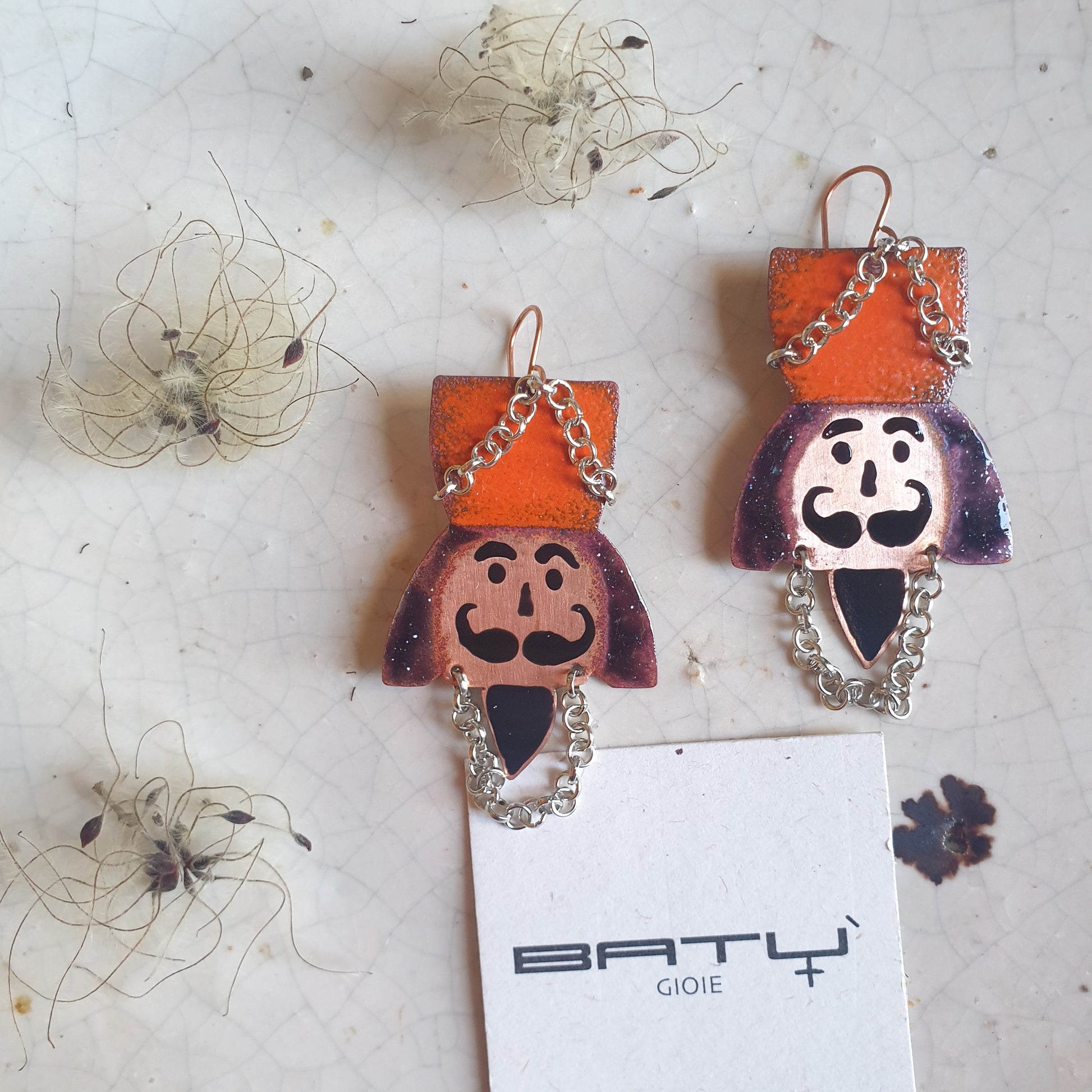 Realizzati interamente a mano in RAME smaltato, dipinti a mano, la monachella è di rame NICKEL FREE. Il retro è liscio color rame.