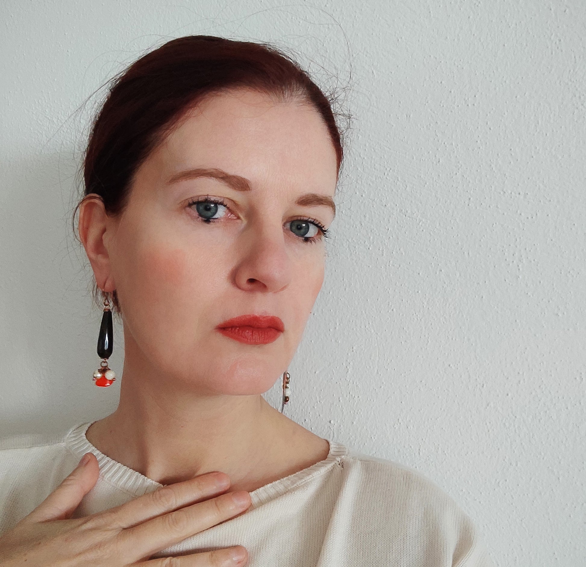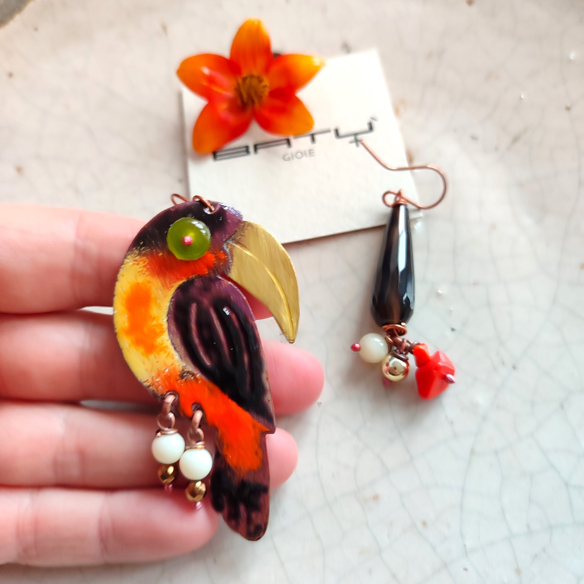 Realizzati interamente a mano in RAME smaltato ed OTTONE, il tucano è singolo abbinato ad una pietra a goccia di agata che ne richiama il colore, la monachella è di rame NICKEL FREE . Il retro è liscio color rame.