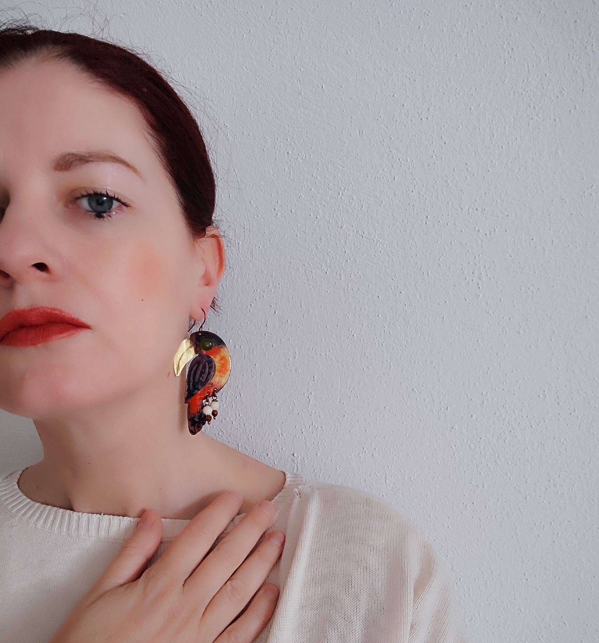 I colori caldi sono una delle caratteristiche distintive di questi orecchini. I toni come l'arancione, il rosso, il giallo e il nero sono tipici e richiamano i colori vivaci del piumaggio del tucano.